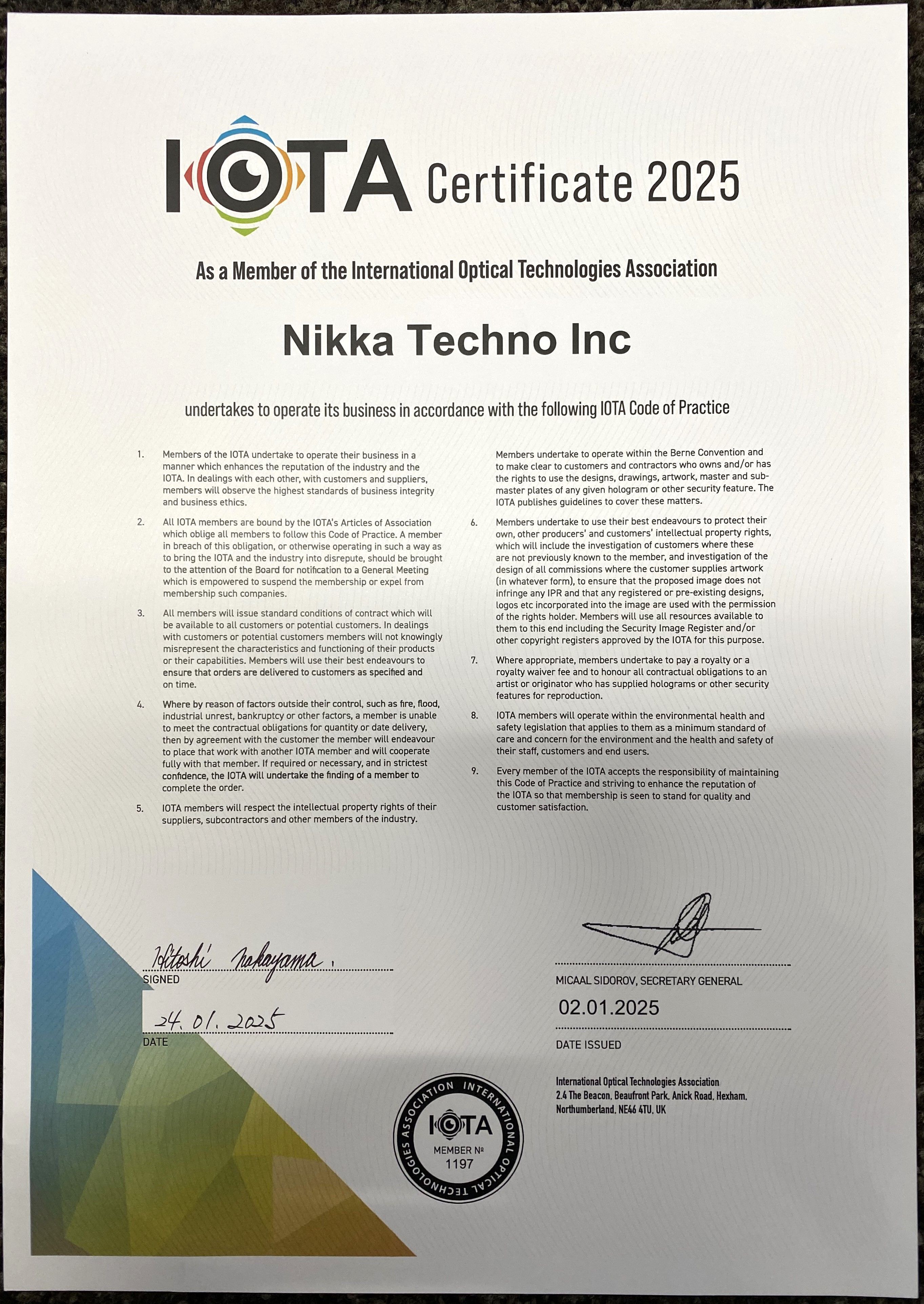 非営利の会員組織である国際光学技術協会は、顧客サポートに於いて最も専門的で高いセキュリティーと品質水準を維持する為に努力する世界70以上の主要なホログラム製造会社により構成されています。IOTAは世界のホログラム製造者と世界の代表として、またその関心へのプロモーションの為に1993年に設立され、すべての会員は加入する前に厳密に審査され、運営水準、経営理論、カスタマーサービス、顧客及び同業他社への知的所有権の保護の尊重等の厳しい実施規範を守っています。