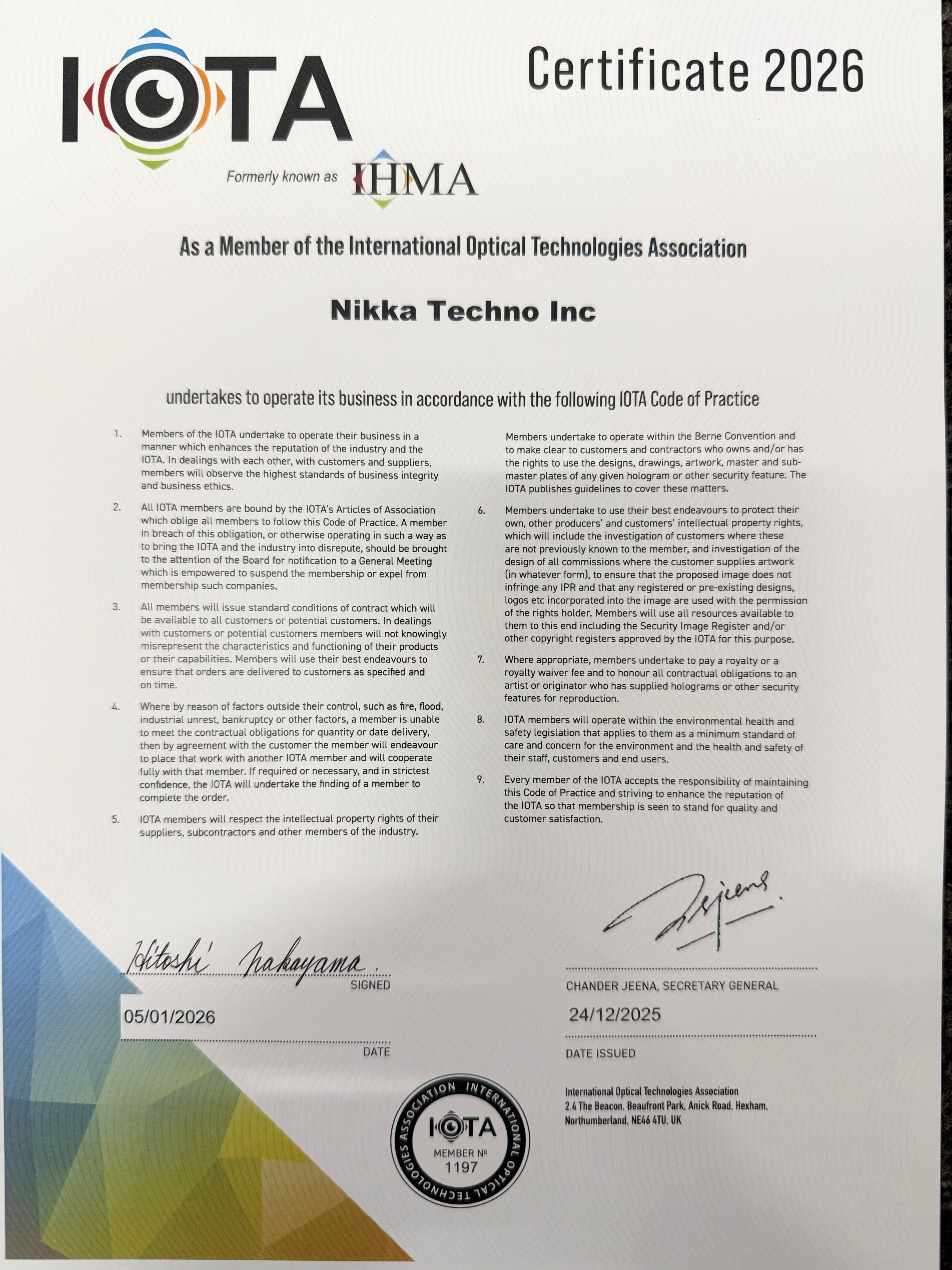 IOTA was established in 1993 to represent hologram manufacturers around the world and to promote their collective interests. All members are subject to a rigorous vetting process prior to admission and are required to adhere to strict codes of practice covering operational standards, management principles, customer service, and respect for the protection of intellectual property belonging to customers and industry peers.